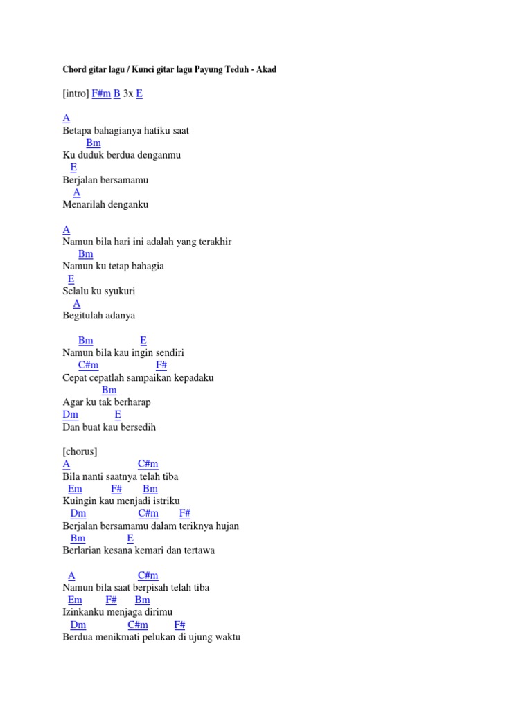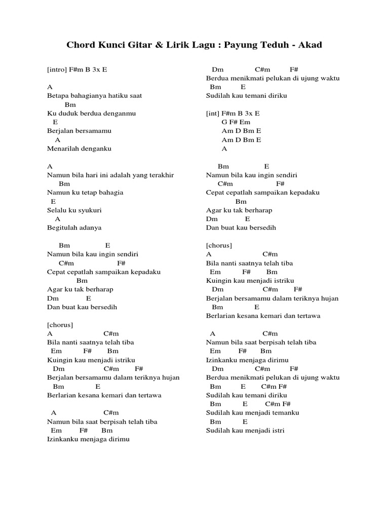 Chord Akad Payung Teduh F Intro Fm A Fm A Fm A DG Betapa bahagianya G hatiku saat Am Ku duduk berdua denganmu C Berjalan. Betapa bahagianya hatiku saat Ku duduk berdua denganmu Berjalan bersamamu Menarilah denganku Namun bila hari ini adalah yang terakhir Namun ku tetap bahagia. Intro Em A 3x D Verse G Betapa bahagianya hatiku saat Am Ku duduk berdua denganmu C Berjalan bersamamu G Menarilah denganku G Namun bila hari ini adalah yang terakhir Am Namun ku tetap bahagia C Selalu kusyukuri G Begitulah adanya Verse Am D Namun bila kau ingin sendiri Bm E Cepat-cepatlah sampaikan kepadaku Am Agar ku.