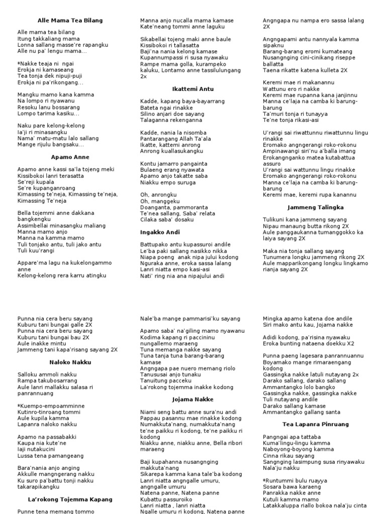 Niami seng battu anne suranu andi Pappau pasannu mange ri nakke Kodong numakkutanang ritene paikku Ritene. Itulah chord lirik dan terjemahan lagu Ridwan Sau Larokong Tojengma Kapang. Mentari Music Malaysia Publishing Released on.