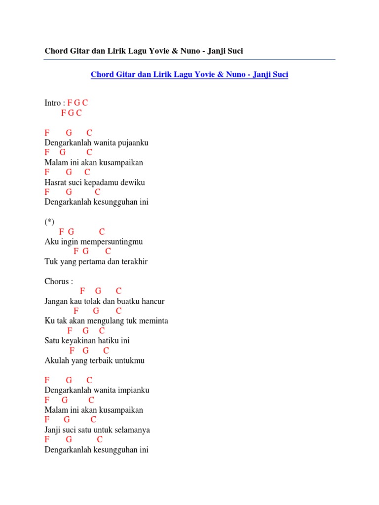 Chordtela yovie and nuno janji suci. CHORD YOVIE NUNO JANJI SUCI intro D E A 2x D E A dengarkanlah wanita pujaanku D E A malam ini akan kusampaikan D E A hasrat suci kepadamu dewiku D E A dengarkanlah kesungguhan ini D E A aku ingin mempersuntingmu D E A tuk yang pertama dan terakhir. Yovie Nuno - Tak Setampan Romeo. Chordtela mengejar mimpi yovie and.