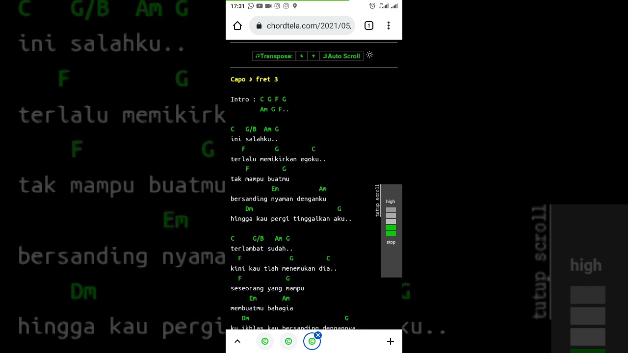 Intro F G Em Am Dm G Verse C G Am G C Ini salahku F G C Terlalu memikirkan egoku F G Em Am Tak mampu buatmu bersanding nyaman denganku Dm G Hingga kau pergi tinggalkan aku C G Am G C Terlambat sudah F G C Kini kau tlah menemukan dia F G Em Am Seseorang yg mampu membuatmu bahagia Dm G Kuikhlas kau bersanding dengannya Reff F G Aku. F G tak mampu buatmu Em Am bersanding nyaman denganku Dm G hingga kau pergi tinggalkan aku. Tak pantas ku bersanding dengannya.