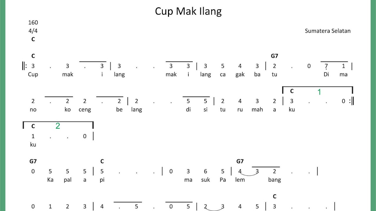 Lagu ini memiliki lirik yang berbeda-beda. Lagu Cuk Mak Ilang juga sangat kental nuansa daerah karena menyelipkan nama-nama daerah dalam lirik-lirik pantunnya. Not Angka Cup Mak Ilang - SEPUTAR MUSIK referensi tentang lagu daerah cuk mak ilang not angka lagu cuk mak ilang - Brainlycoid Not Angka Cup Mak Ilang Dunia Not Angka Not balok lagu cuk mak ilang - Brainlycoid TiffanyoutlookCom Hanoi 44 Viet Nams comments from Her and His Life Journal Showing 1-5 of 5 Lirik Lagu Cuk Mak Ilang Sumatera Selatan - Arti dan Makna not angka.