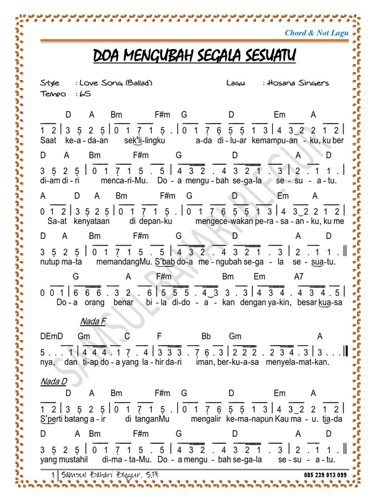 Chord Doa Mengubah Segala Sesuatu Regina Pangkerego Bait. D A Bm Fm G - A A7 D A Bm Fm G Saat keadaan seklilingku Fm Em A Ada di luar kemampuanku D A Bm Fm Ku berdiam diri mencari-Mu G D A D A Doa mengubah segala sesuatu D A Bm Fm G Saat kenyataan di depanku Fm Em A Mengecewakan perasaanku D. Doa orang benar bila didoakan.