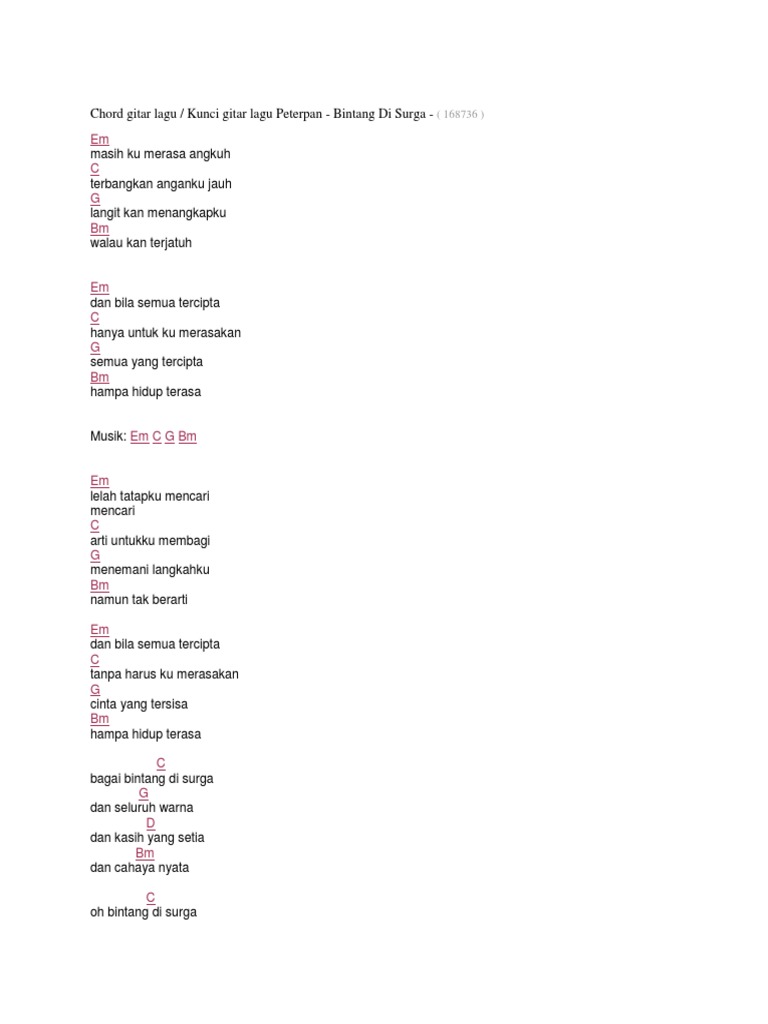 Terima kasih tuhan kau telah sempurnakan A Dm Telah engkau ciptakan dia untuk diriku Chorus. Tetaplah Menjadi Bintang di Langit. Lihat chord kunci gitar Padi Kasih Tak Sampai dari nada dasar D.