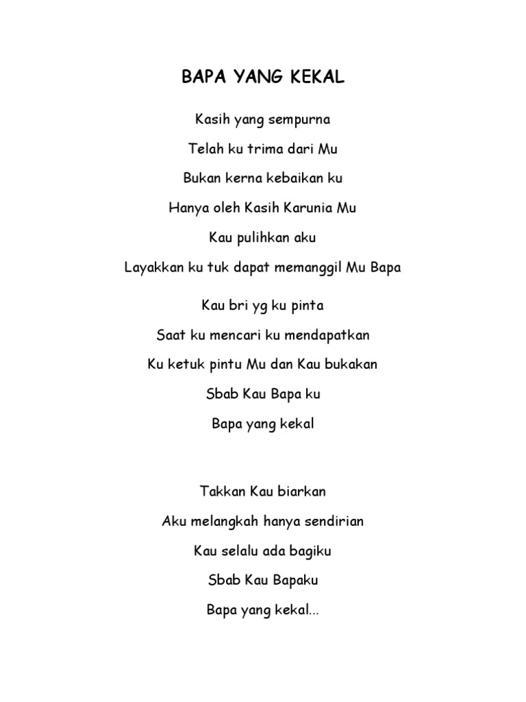 42Karena itu berjaga-jagalah sebab kamu tidak tahu pada hari mana Tuhanmu datangLIRIK LAGU BAPA YANG KEKALkasih yang sempurnatelah ku terima da. HttpsyoutubeoXbRTijuAyMBapa yang Kekal Minus One Karaoke Hour Rush Music BapayangKekalHourRushMusicMinusOnechrist lagukristen kristen cathol. Kau bri yang ku pinta saat ku mencari ku mendapatkan ku ketuk pintu-mu dan kau bukakan sbab kau bapaku bapa yang kekal.