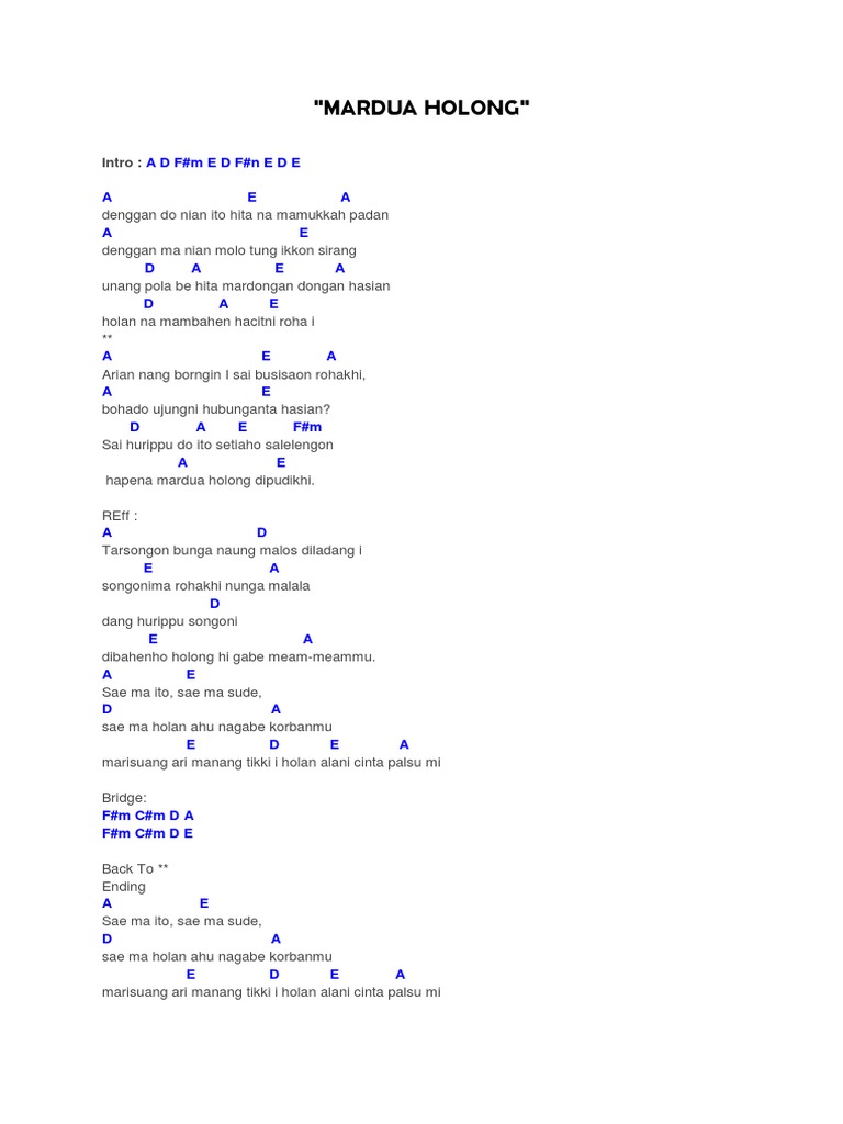 Chord lagu batak mardua holong. Kunci Gitar Mardua Holong Omega Trio - Lagu Batak Lirik cover. Intro G C G D 2x Verse 1 G D G Denggan do nia ito hita na mamukkah padan G D Denggan ma nia molo tung ikkon sirang C G D G Unang pola be hita mardongan dongan hasian C G D Holan na mambahen hacit ni roha i G D G Arian nang borngin sai busisaon rohakhi G D Bohado ujungni pargaulanta hasian C G D G Sai hurippu do ito.