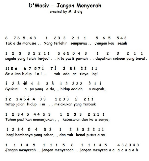 Not Angka Lagu Jangan menyerah - DMasiv - D Masiv adalah grup band terkenal di Indonesia. Gambar-gambar yang melambangkan bunyi tersebut dituliskan dalam Not balok sesuai dengan tinggi-rendah dan sifat bunyi yang dilambangkan. Walaupun sekarang sudah lama tidak muncul di televisis.