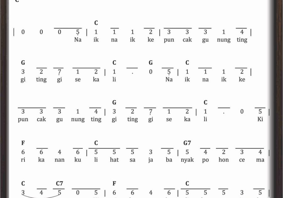 Not Angka Lagu Anak Mudah Naik Naik ke Puncak Gunung. Naik Naik Ke Puncak Gunung NN Ternyata lagu Naik-naik ke Puncak Gunung benar berasal dari Maluku. Abduh imanulhaq lihat foto.