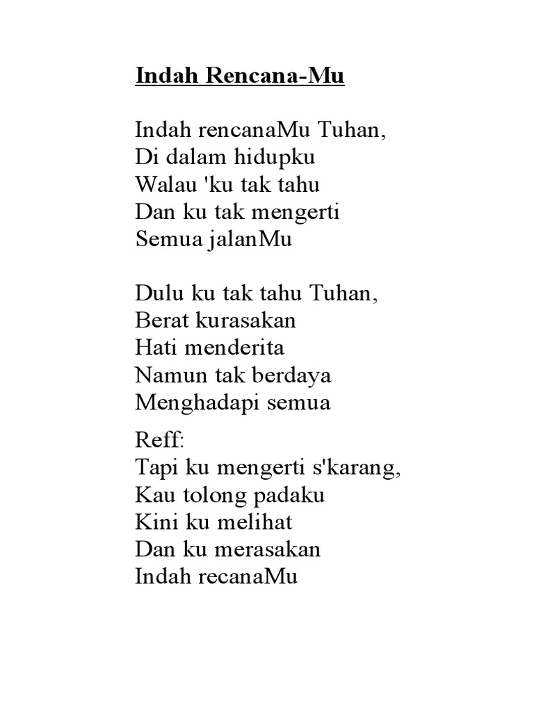 Not indah rencanamu tuhan. Not Angka Lagu Imagination Shawn Mendes. Matius 2442 Karena itu berjaga-jagalah sebab kamu tidak tahu pada hari mana Tuhanmu datangLIRIK LAGU INDAH RENCANAMUindah rencanaMu Tuhan didalam hidupkuwalau ku tak tahu dan ku tak mengerti semua jalanMudulu ku tak tahu Tuhanberat kurasakan hati menderitadan ku tak berdaya menghadapi semuatapi kumengerti skarang Kau tolong padakukini kumelihat dan kumerasakan indah. Temukan lagu terbaru favoritmu hanya di.