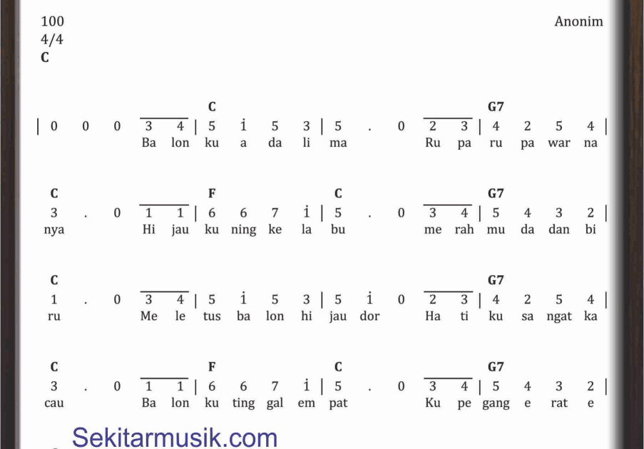 Not Angka Lagu Balonku Ada Lima