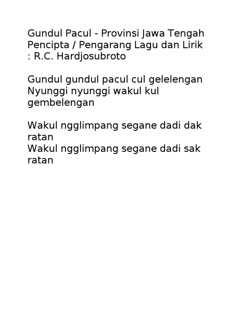 Gundul Pacul Pencipta Lagu. Meski di setiap buku lagu-lagu daerah nama R. Lagu Gundul Gundul Pacul merupakan lagu daerah berasal dari Jawa Tengah.