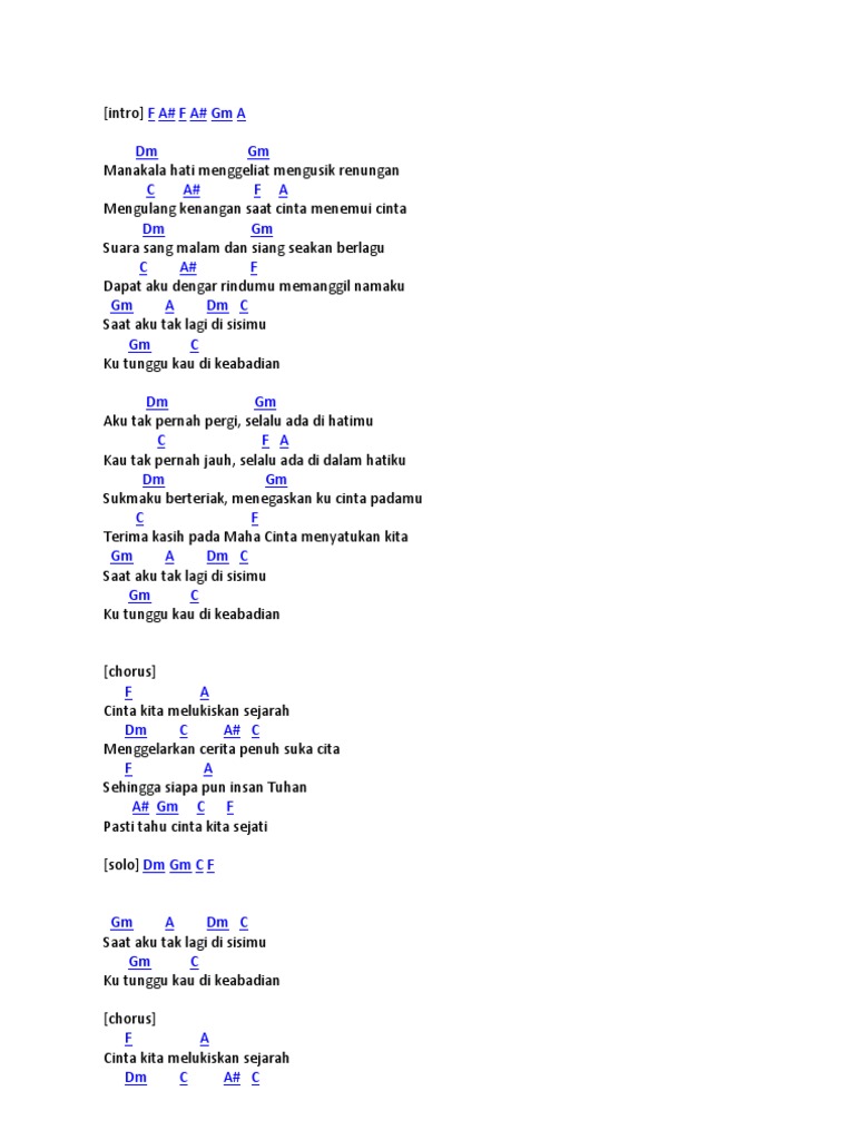 A sayang dan kasihku padamu tetap abadi G sampai akhir masa kunanti slalu ku nanti A semoga kau dan aku satu hati sampai mati G tak pernah berubah oh kasih Bm tak kan terganti. JANGAN LUPA BERSYUKUR Id new skin. Dm A A Dm x3 Dm Dm Rindunya aku saat ini Dm A Rindu padamu kasih Gm Dm Puas ku cuba menghubungimu A A Namun kau diam membisu Dm Apa salahnya diri ini Dm A Kau seksakan hidupku Gm Dm Pergimu tika ku memerlukan A Dm Cebisan kasih dan sayang Gm Dm Aku inginkan cinta yang berkekalan A Dm Kau.