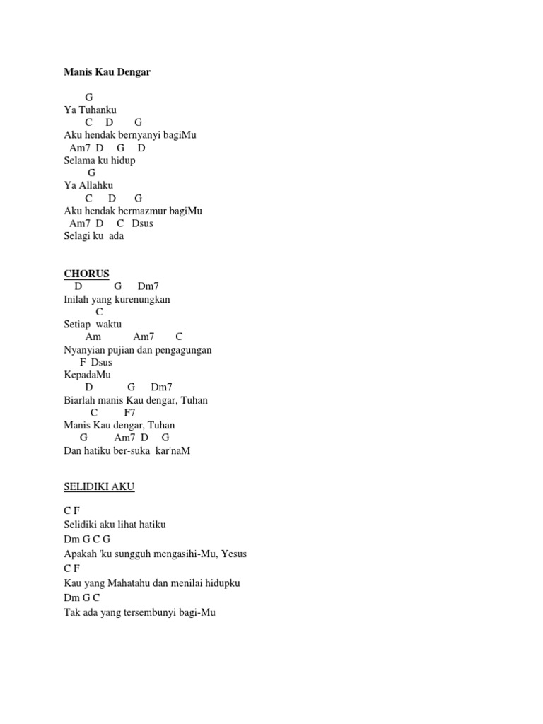 G C F Selidiki Aku Lihat Hatiku Dm G FmC C Apakah Ku Sungguh Mengasihi-Mu Yesus G CE Kau Yang Maha Tahu F Dan Menilai Hidupku CG G C Gm7 Tak Ada Yang Tersembunyi Bagi-Mu Reff. Verse 1 G Ujilah Aku Tuhan C D G Cobalah Aku Tuhan C D Bm Em Selidiki Batinku Dan Hatiku Am D G C Mataku Tertuju PadaMu Verse 2 G D G Aku Cinta PadaMu Tuhan C D G Aku. Selidiki a-ku lihat hatiku Em Dm G7 FmC C Apakah ku sungguh menga-sihiMu Ye - sus G CEm7 F Kau yang maha tahu dan menilai hidupku Dm G C Gm7 tak ada yang tersembunyi bagiMu Reff.