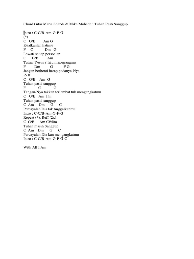 A E Cm B Gm F C Fm G Am F Dm Em Chords for Maria Shandi - Tuhan Pasti Sanggup - Lagu Rohani with song key BPM capo transposer play along with guitar piano ukulele. Tuhan sanggup tak pernah gagal. F Dm Bb Gm G Cm Am A C Em Eb D Ab B Bm Chords for Allah Sanggup by LGLP with capo transposer play along with guitar piano ukulele mandolin.
